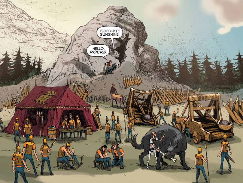 Jason, Piper y Leo se dirigieron al claro donde se encuentra ubicado el Puño de Zeus en su búsqueda de Buford, la mesa de Leo. Piper comentó que la zona estaba maldita y que los campistas se mantenían alejados.